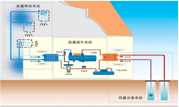 水源熱泵工作原理大致是,夏季將建筑物中的熱量轉移到水源中,由于水源溫度低,所以可以高效地帶走熱量,而冬季,則從水源中提取熱量。