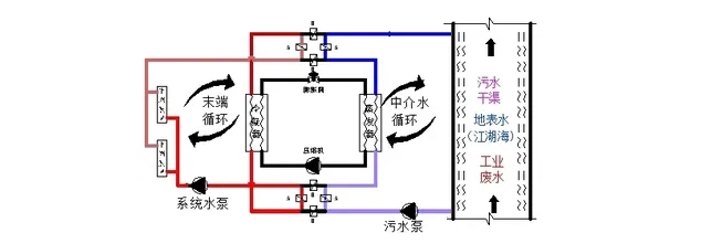 顧名思義,污水源熱泵系統(tǒng)就是從污水中提取和儲存能量的冷、熱源,借助熱泵機組,消耗少量電能,夏季把室內(nèi)熱量“提取”出來釋放到污水中,為室內(nèi)制冷;冬季把污水中的低位熱能“提取”出來,為建筑物供熱。夏季制冷、冬季制熱工況通過切換閥門實現(xiàn),具體工作原理如圖所示。