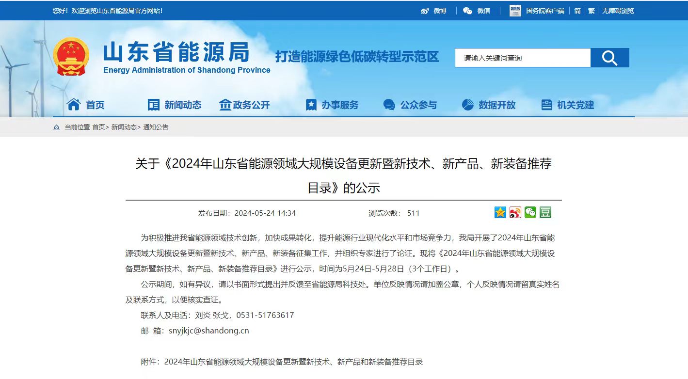 近日,山東省能源局發(fā)布關(guān)于《2024年山東省能源領(lǐng)域大規(guī)模設(shè)備更新暨新技術(shù)、新產(chǎn)品、新裝備推薦目錄》的公示。