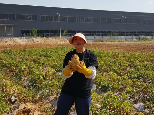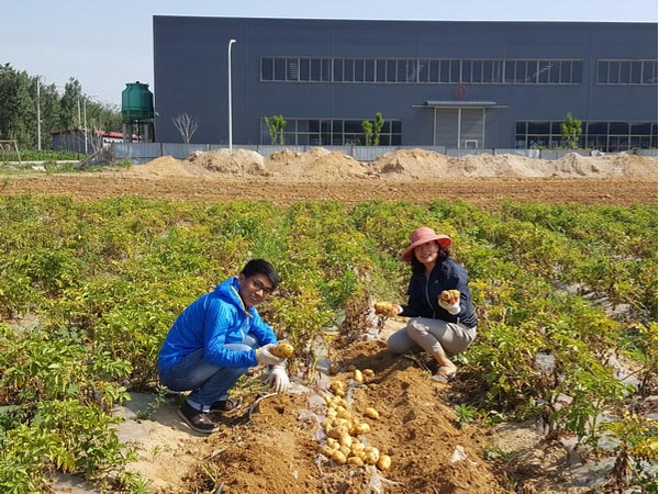 很多員工也是第1次刨土豆,不太了解這種被稱為“植物黃金”的收獲秘訣。土豆通過根莖生長,圍著根部生長很靠近地面,喜歡松軟沙質的土壤。經過簡單的指導,大家很快找到了正確的要領,只要輕輕拔掉葉苗,根尾的幾個小個子就先帶出來,再稍稍扒開一點土壤,躲藏在下面的胖大家伙就都乖乖的露出了大白肚皮。在豐收的田野上,大家發揚風格,挽起袖子、褲腿,彎下腰,掄起胳膊,開始挖起來,現場個個干勁十足、熱火朝天。刨出土豆的那一刻總是有些興奮,就象挖到寶藏,比賽著誰挖到的個頭更大。一些被嚙齒類動物咬過的土豆是不可以和健康土豆放在一起的,因為它們會導致更多土豆的腐爛。滿滿的種植知識分享,只有在親身勞作時才可以學到。隨后大家兵分幾路,負責搬運的把土豆集中在一起,負責裝箱的將土豆按照大小進行分揀裝箱,很快一箱箱新鮮的土豆被裝車運往廚房。